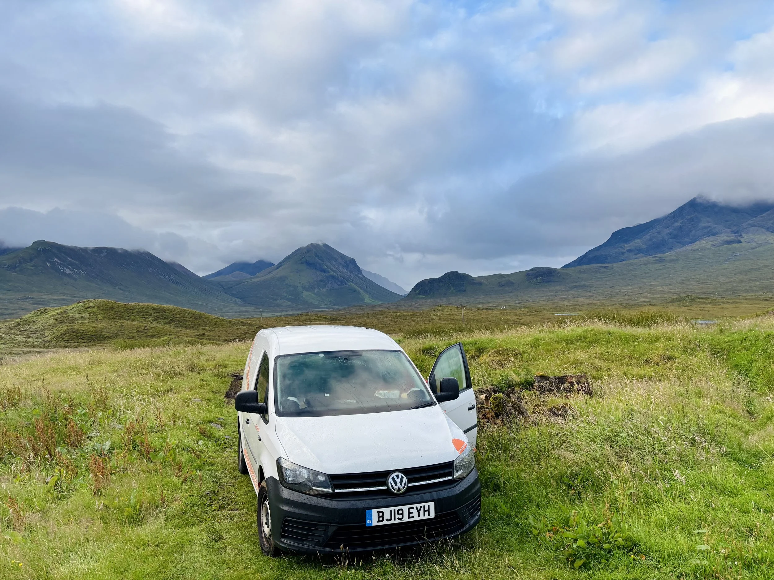 🚐 As evening set in, we followed the A863 toward Dunvegan, keeping an eye out for wild camping spots. This stretch of road is full of possibilities — little pull-offs by grassy flats overlooking the mountains make for peaceful overnight stays.
